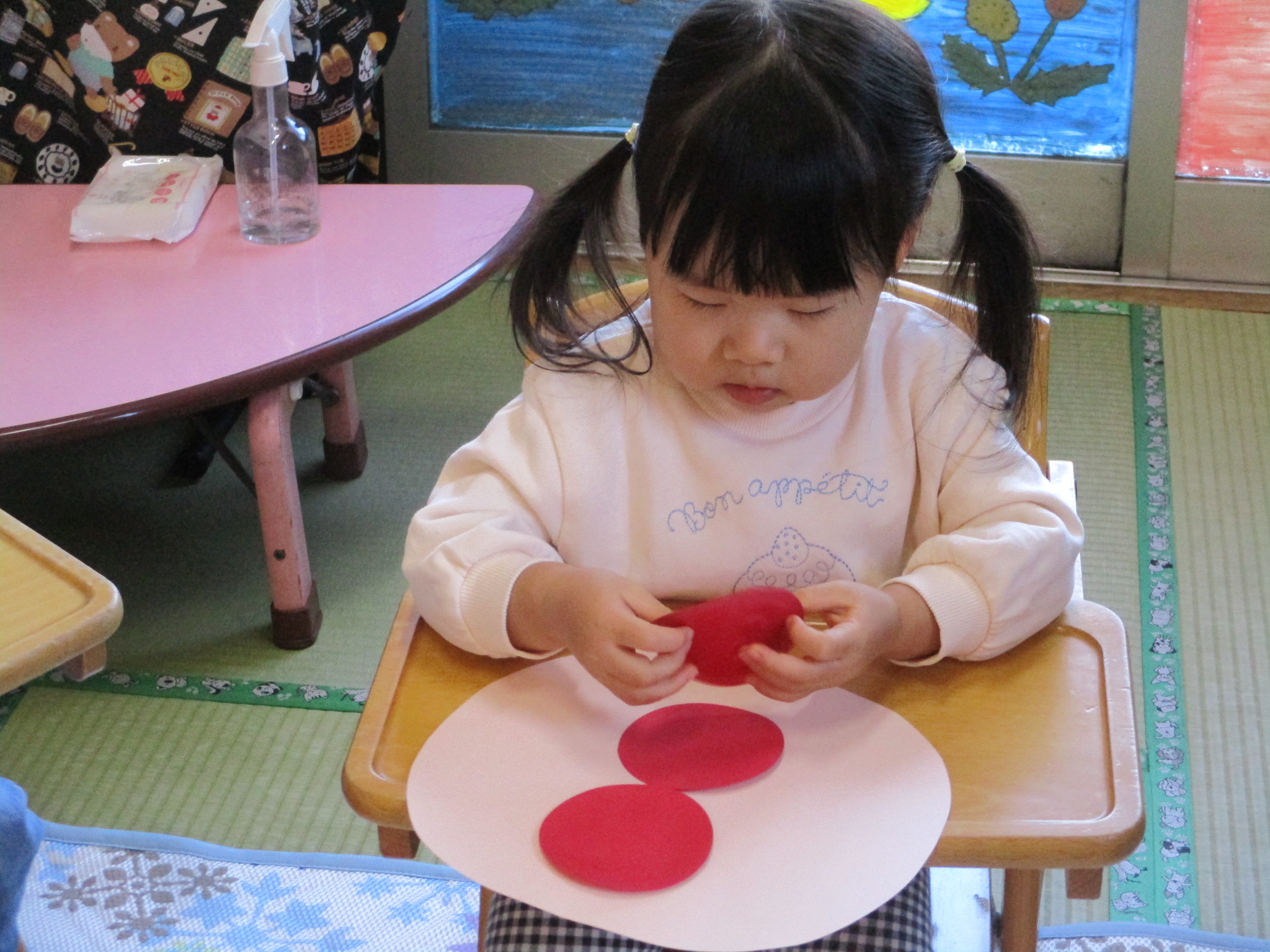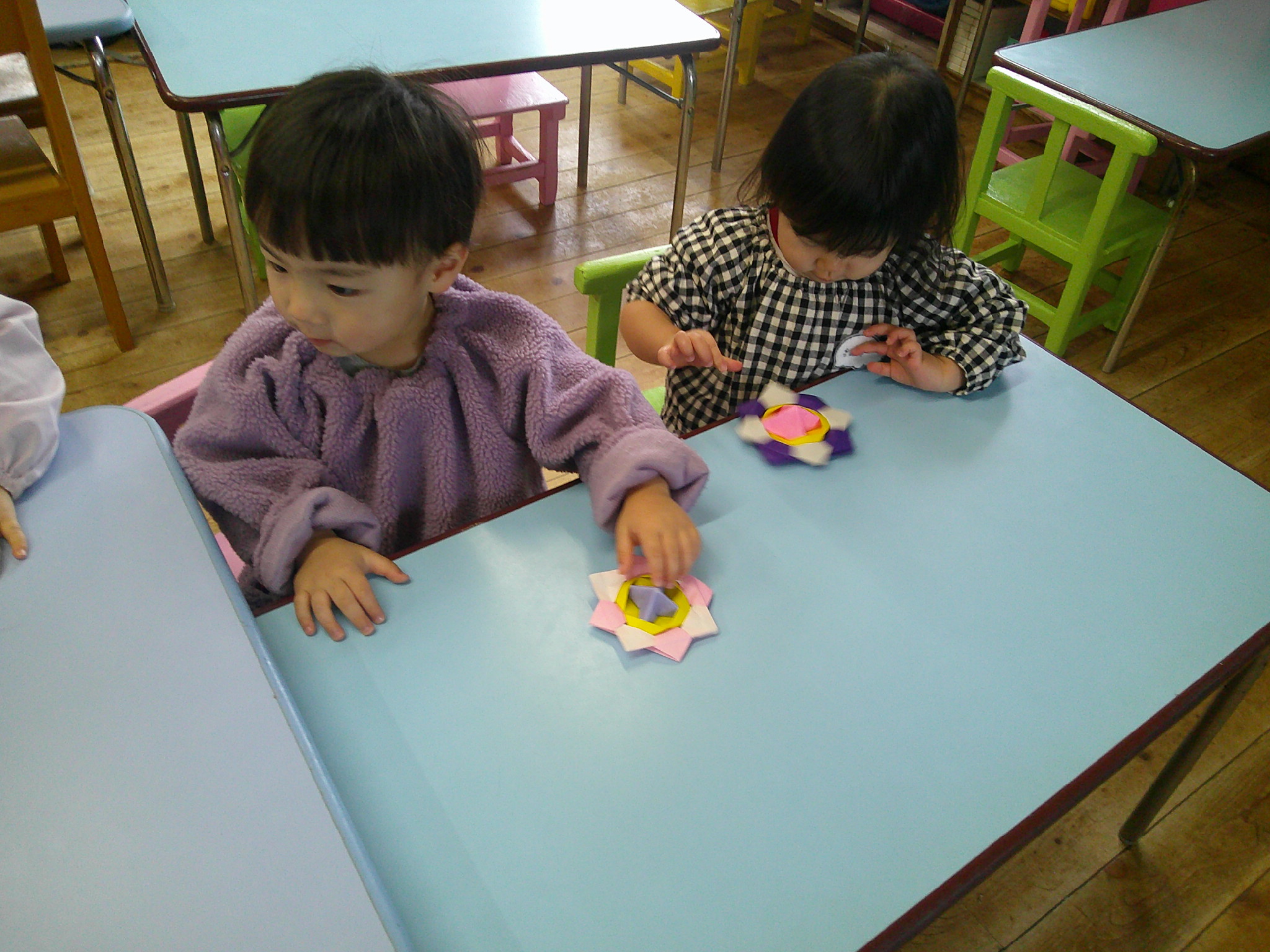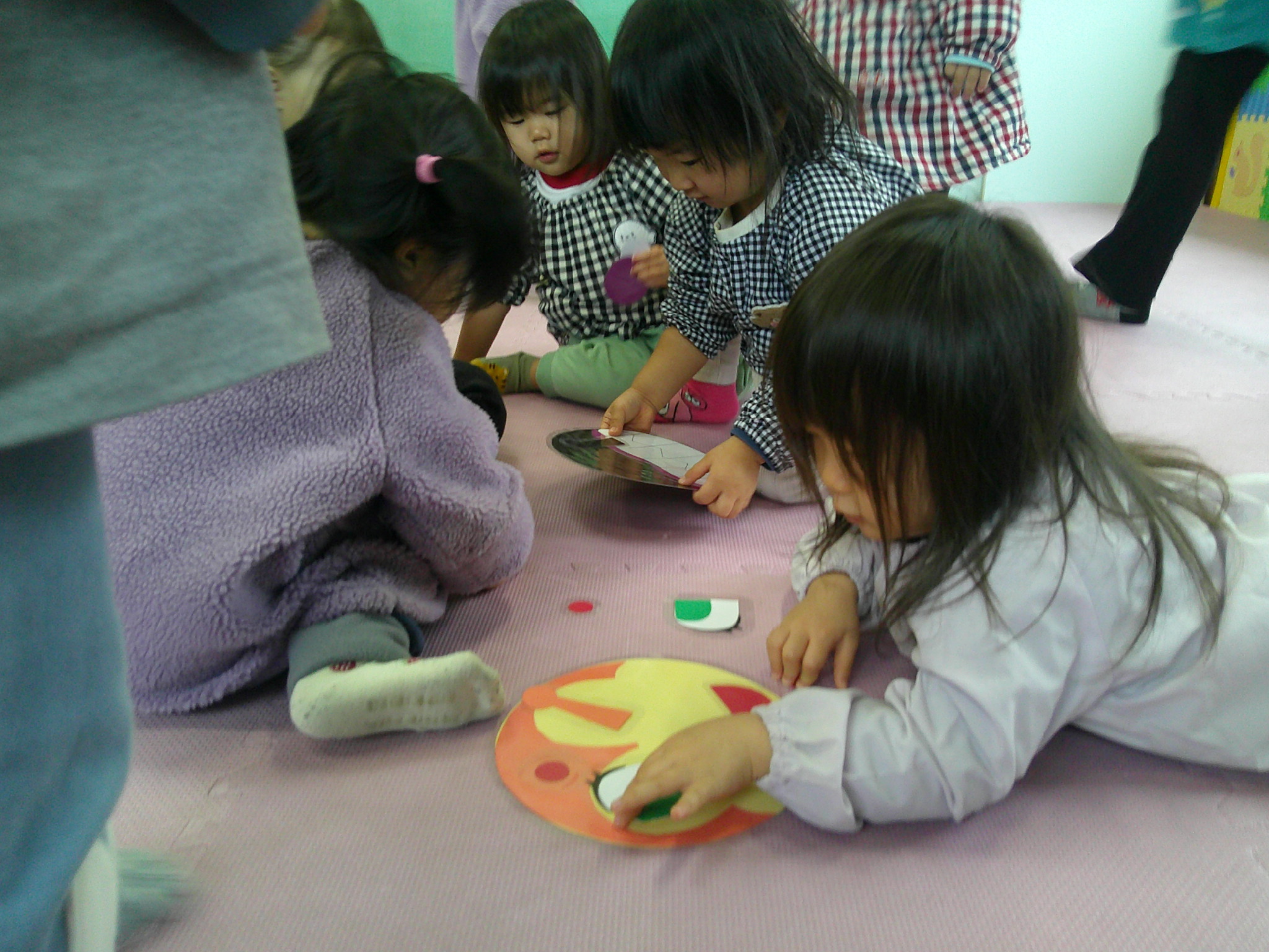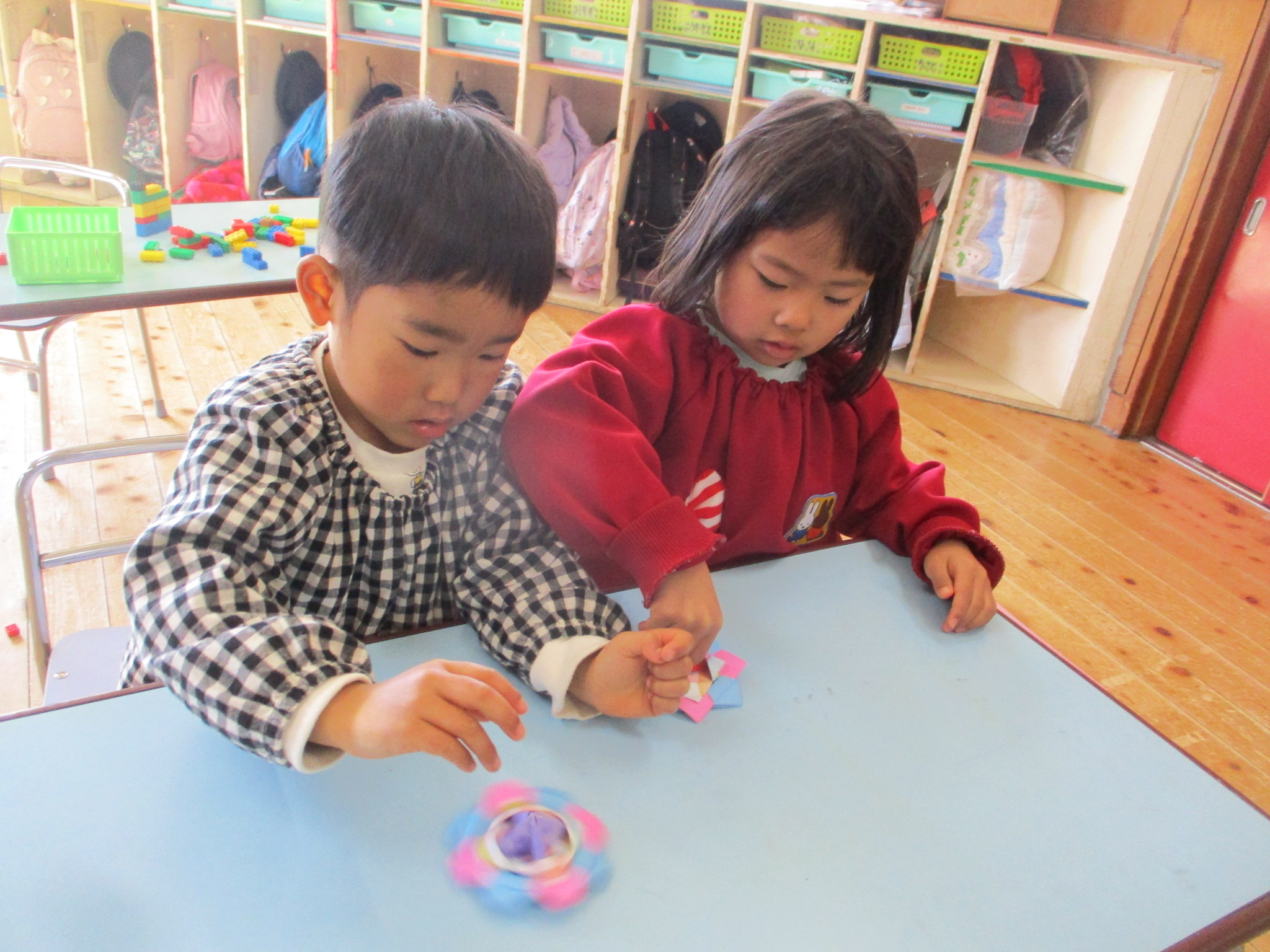 思いの向くまま楽しそうに貼る子や、ひとつひとつ考えながら貼る子など同じ素材でもそれぞれ
