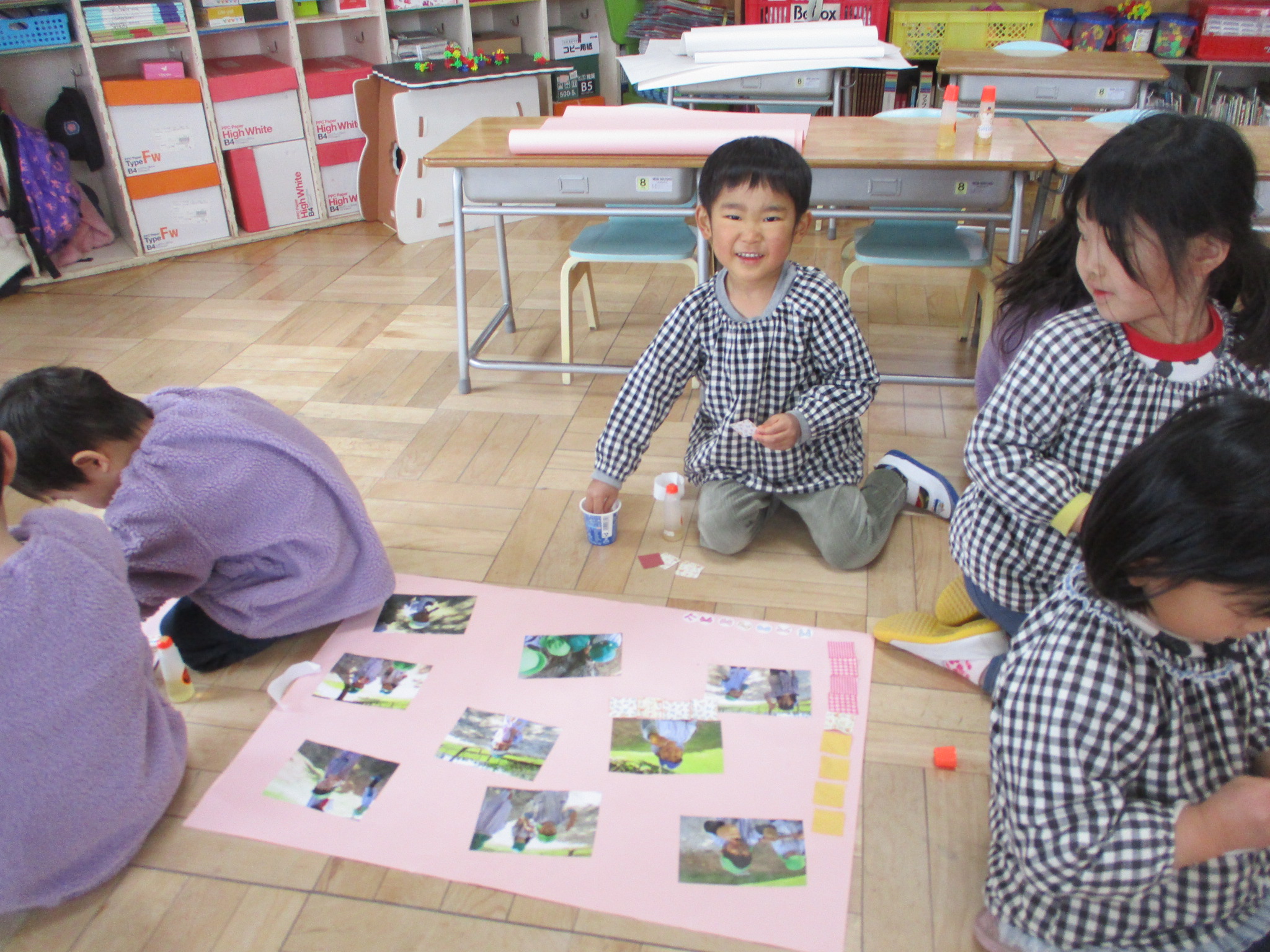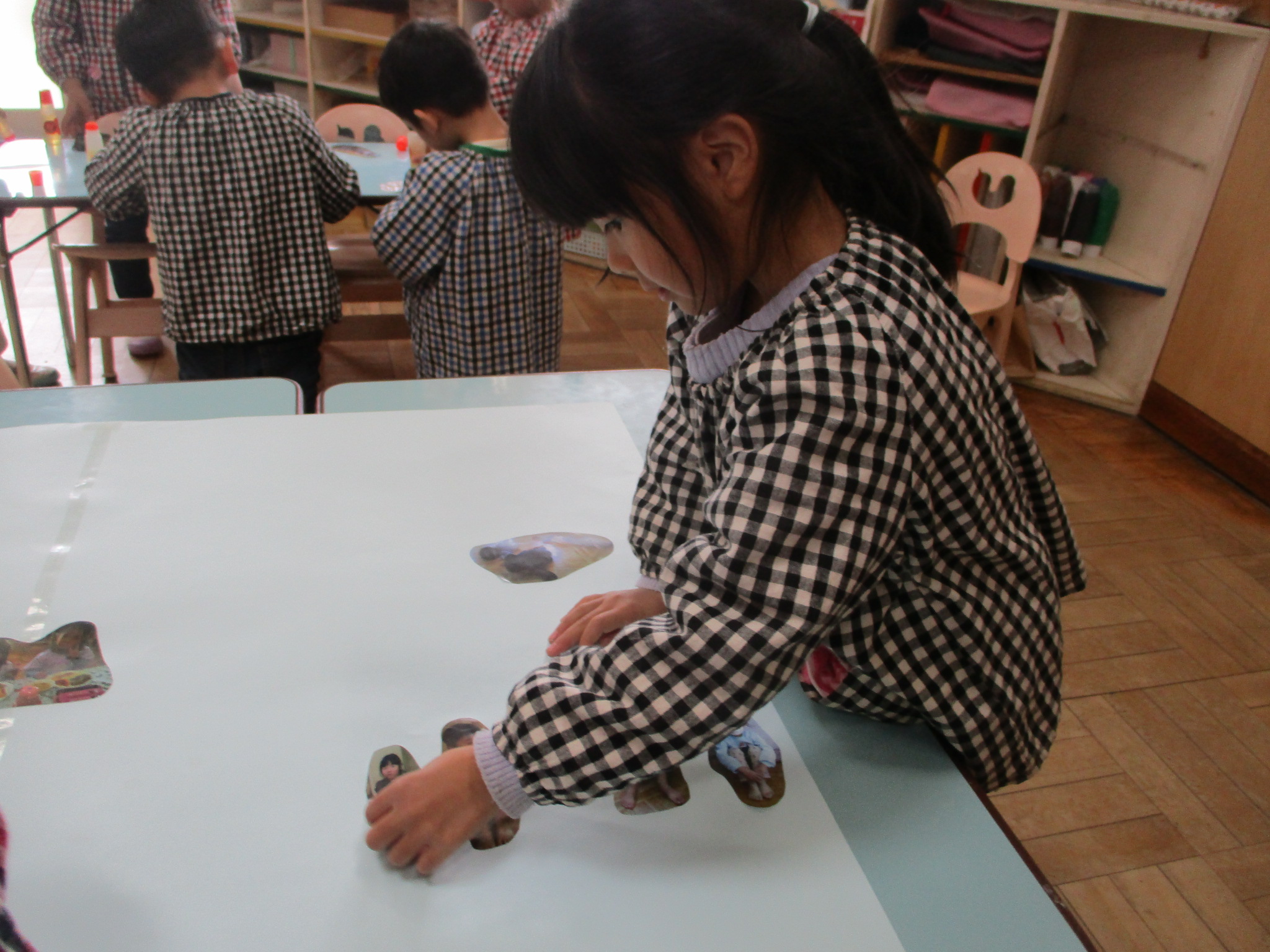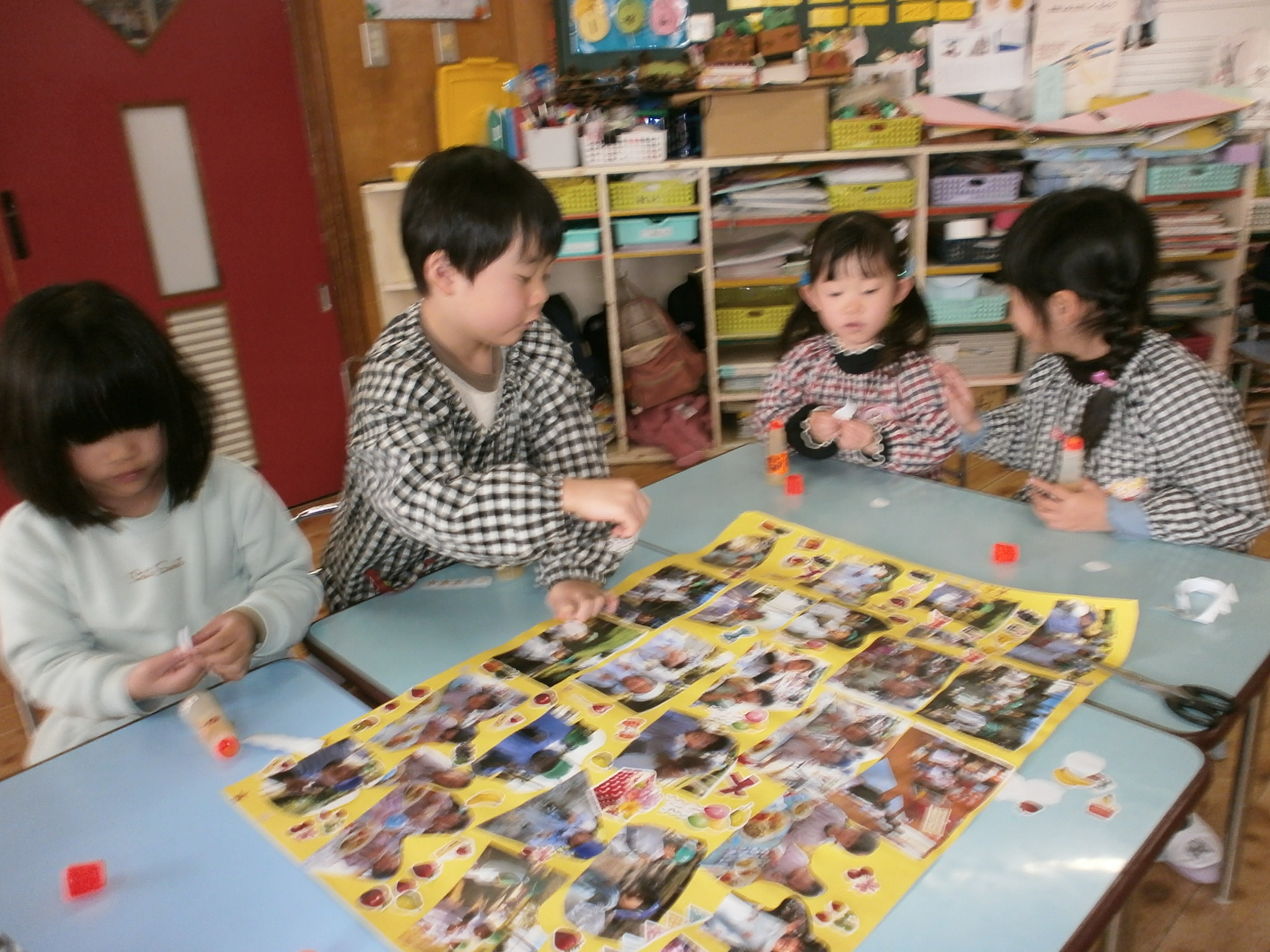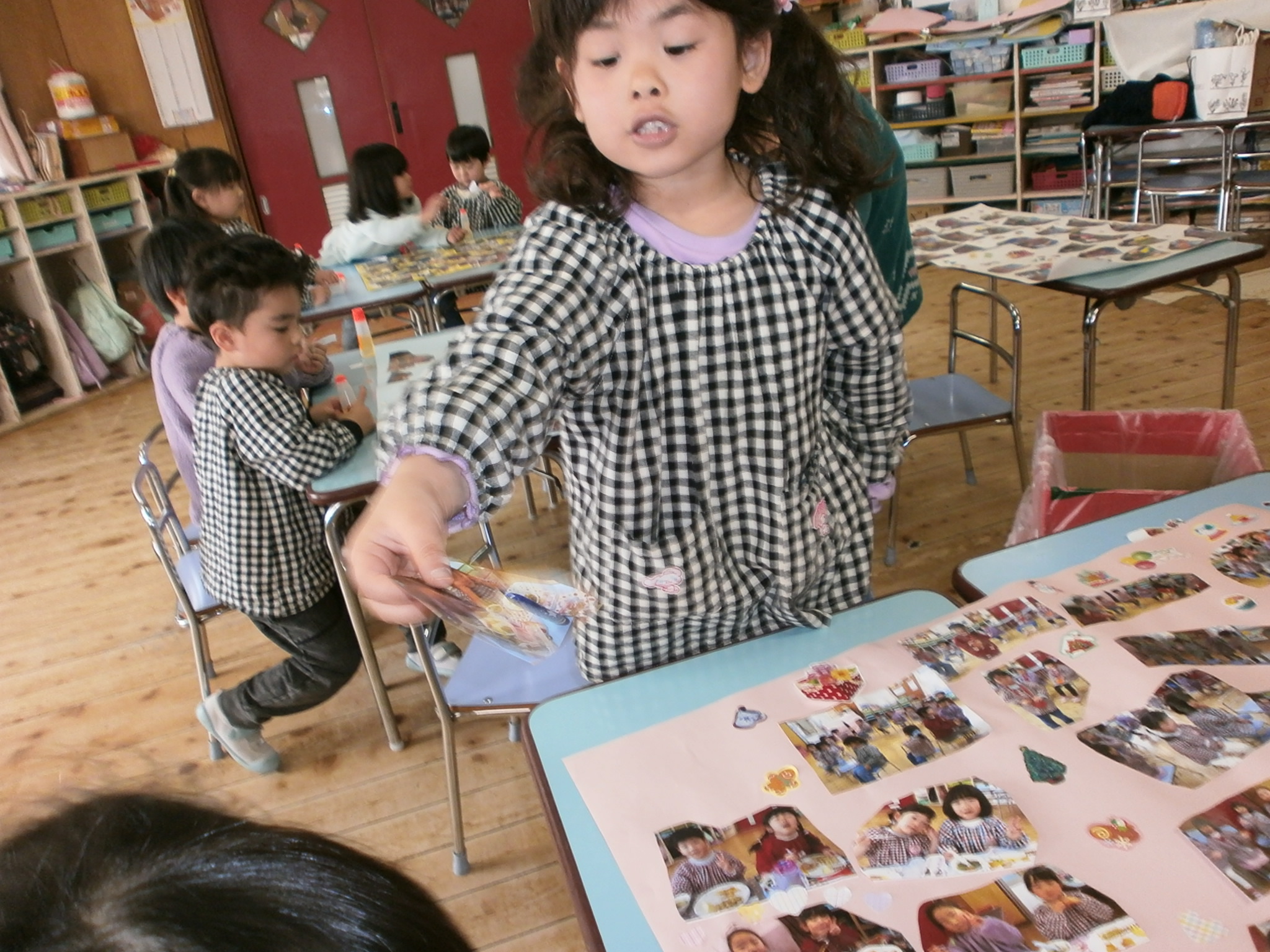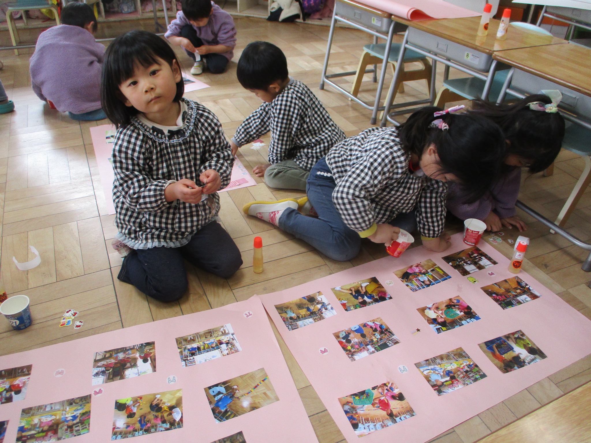 今まで行ってきた集団遊びなどの写真を、みんなで台紙にのり付けしていきました。