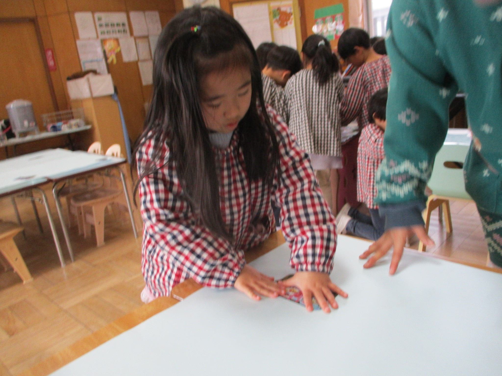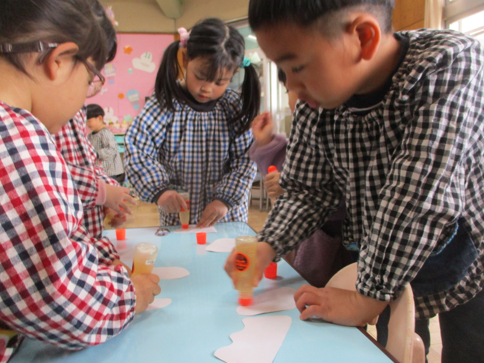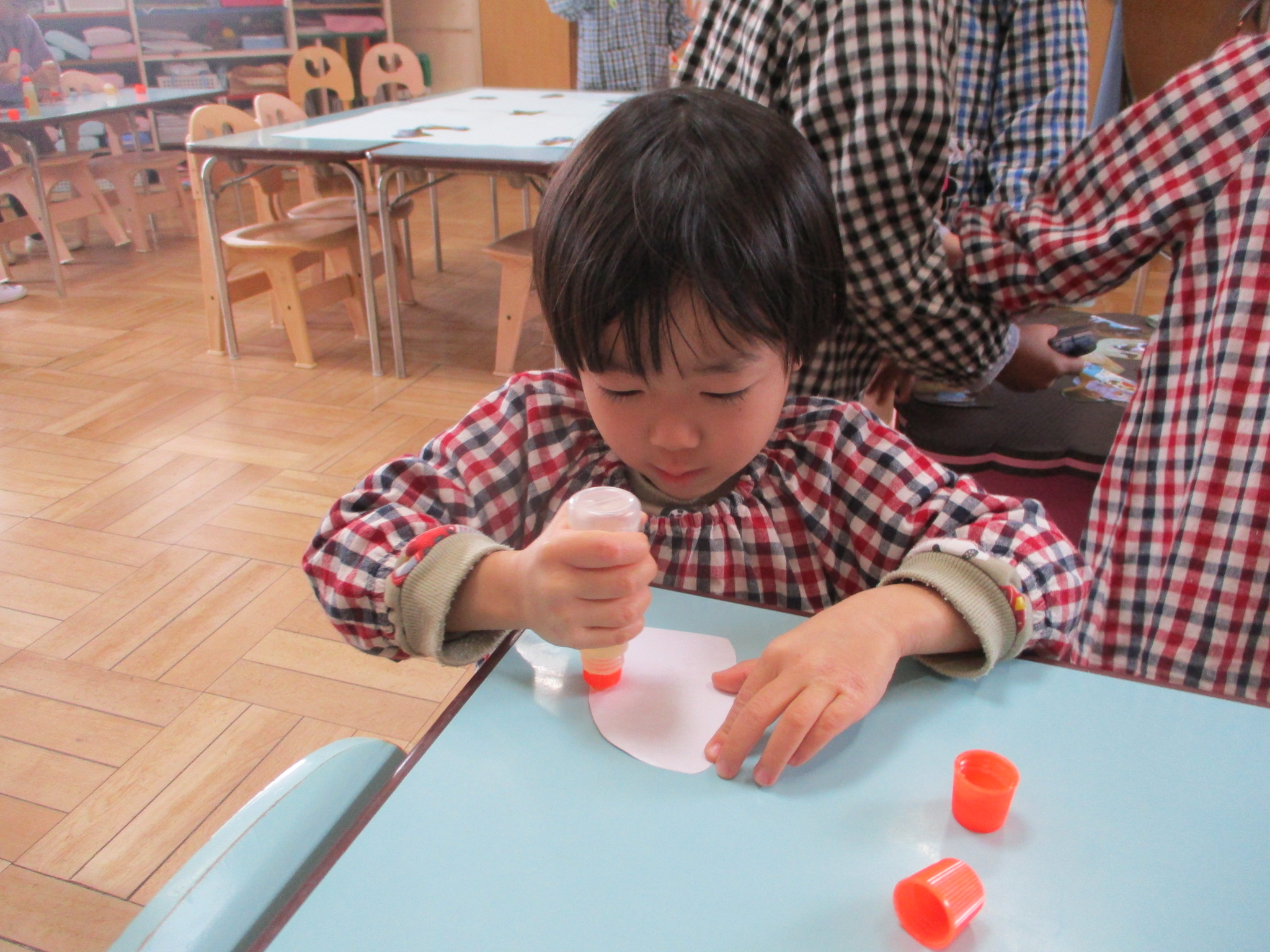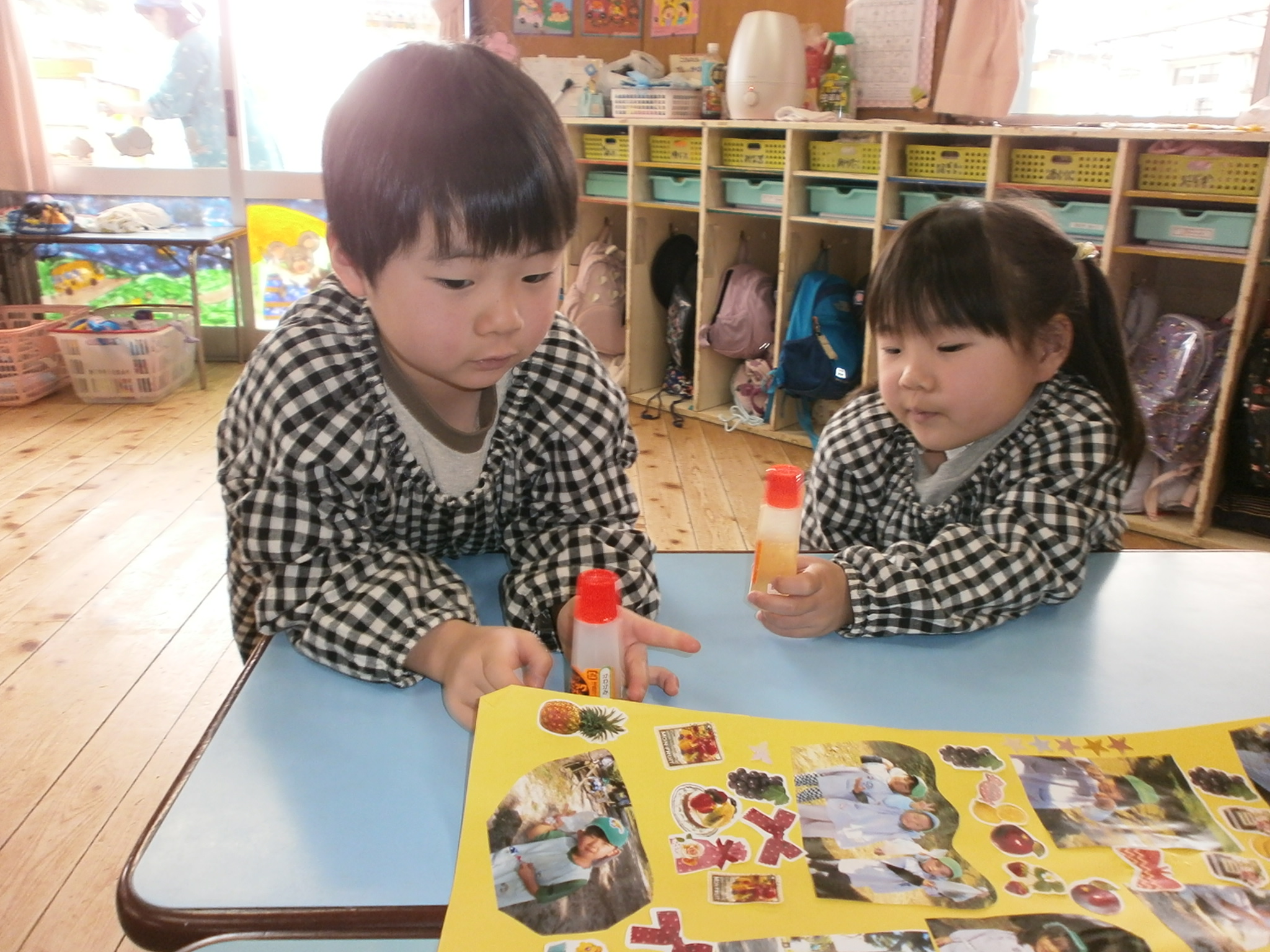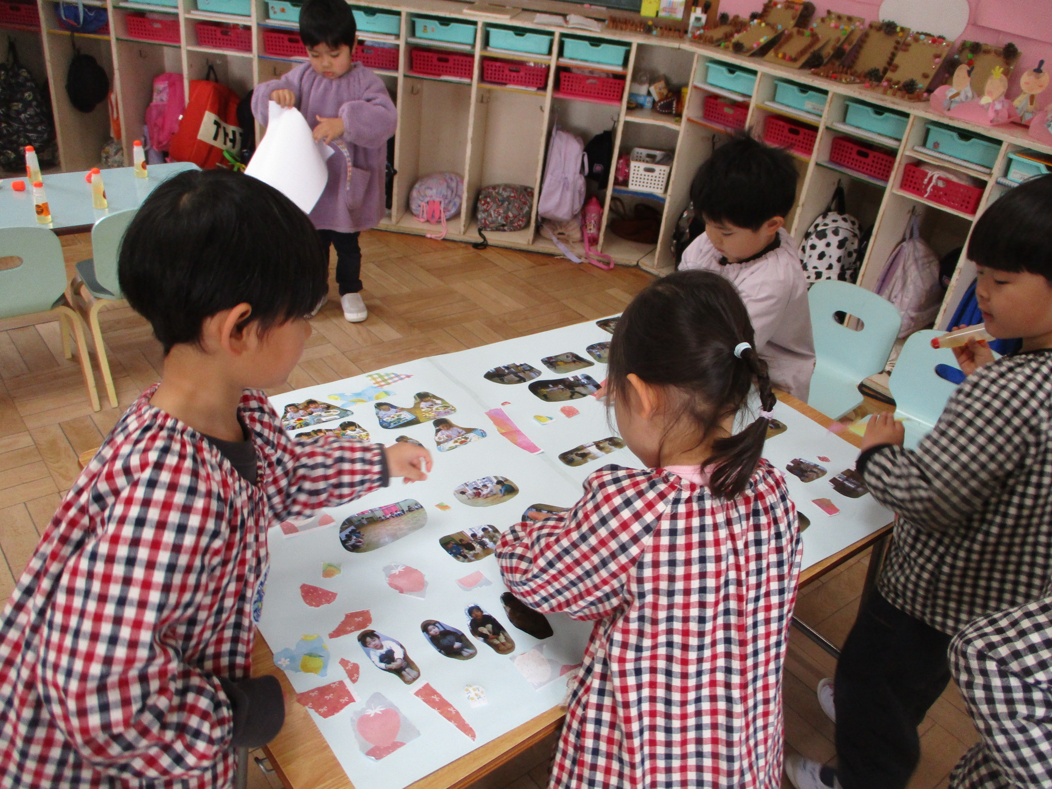 今まで行ってきた集団遊びなどの写真を、みんなで台紙にのり付けしていきました。