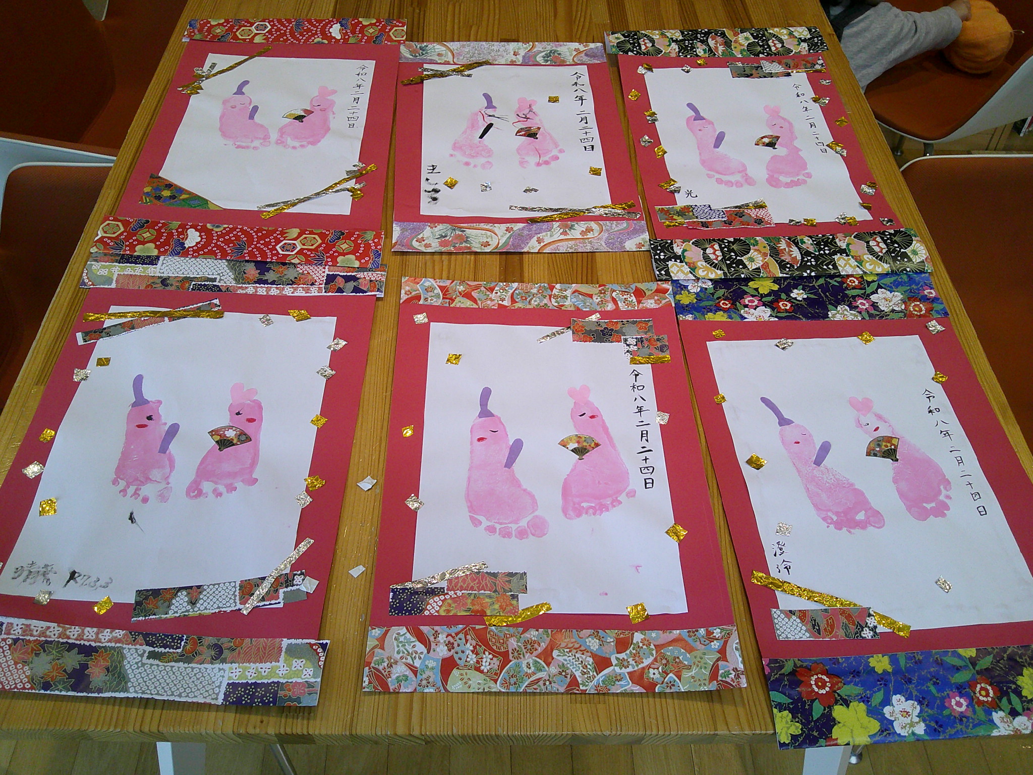 可愛い足型にお顔を描いて、飾りつけをするとステキなお雛様の掛け軸ができあがりました。