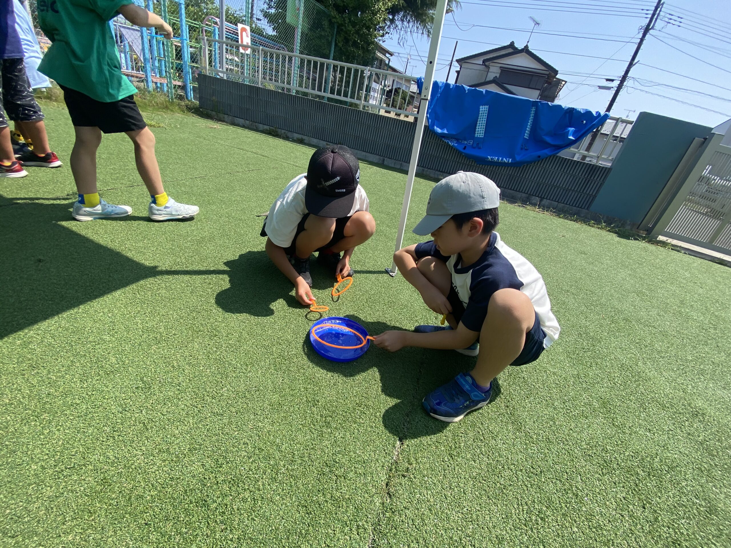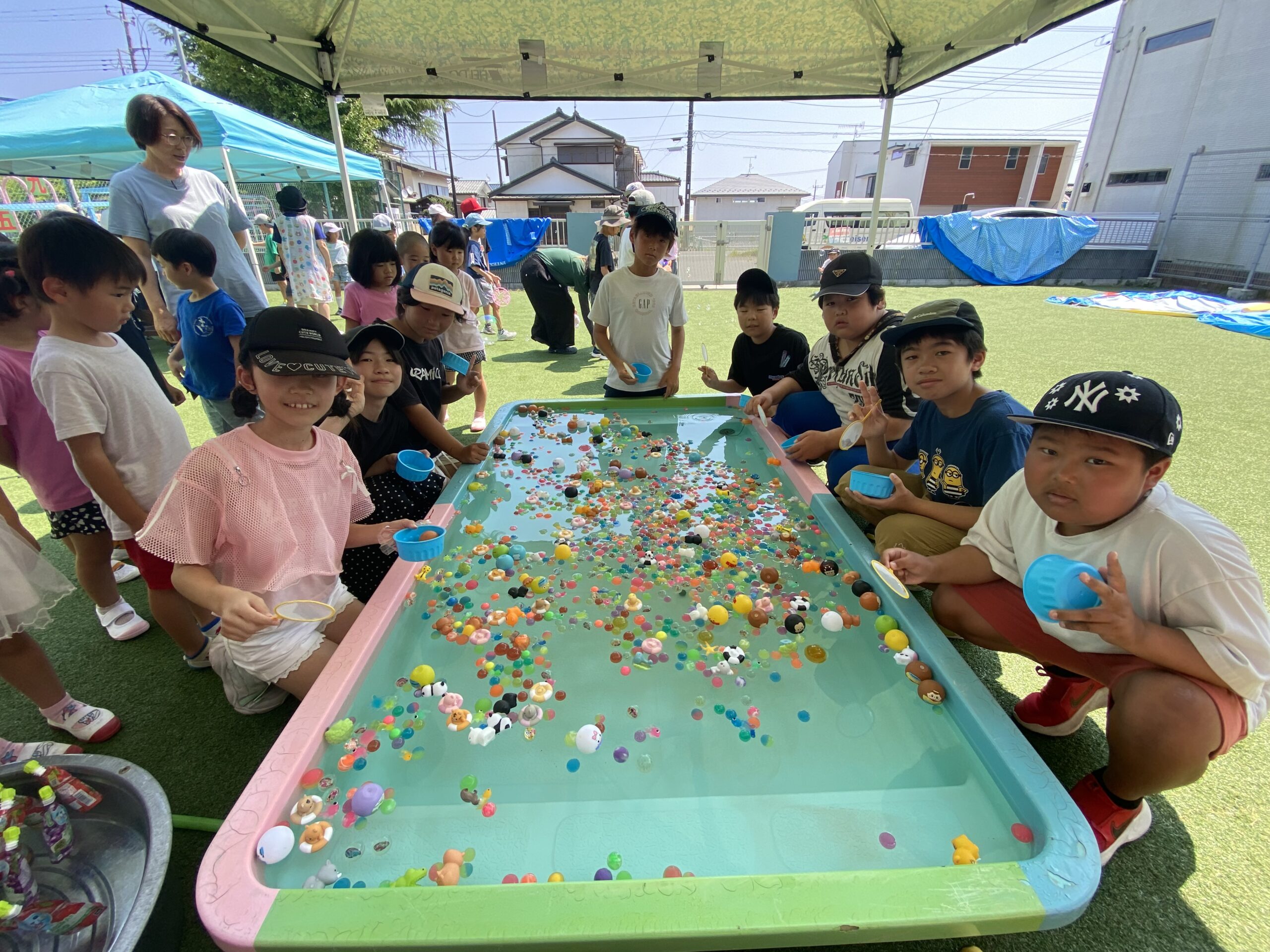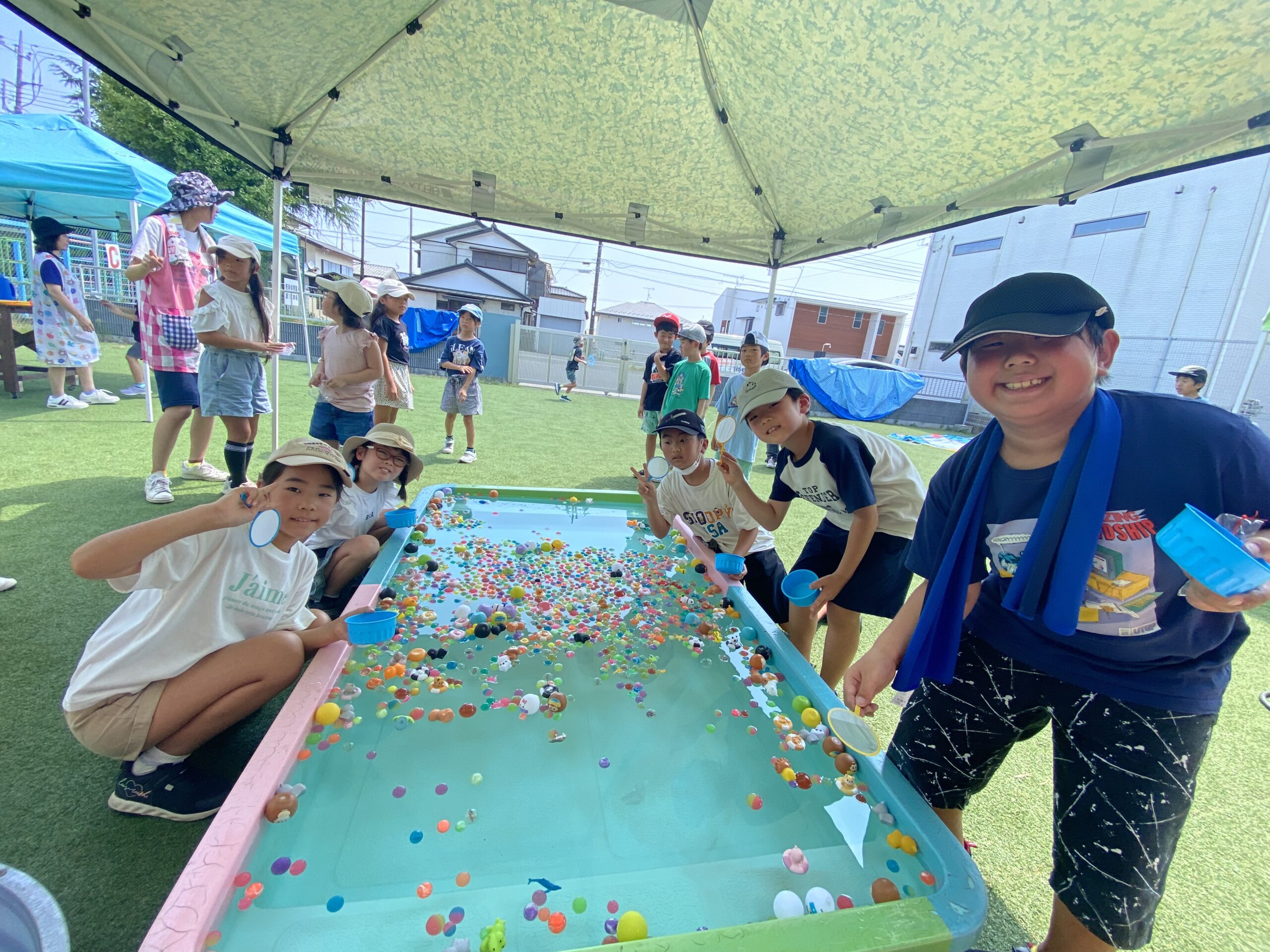 午前中は外で熱中症対策を行いながらスーパーボールすくいやシャボン玉で遊び、