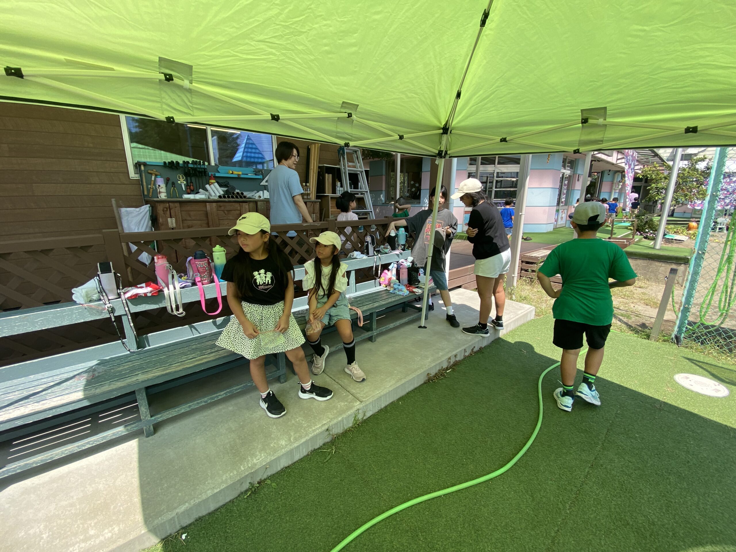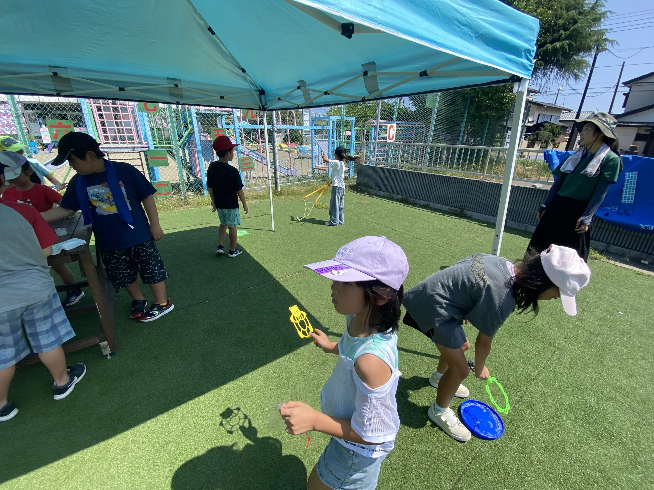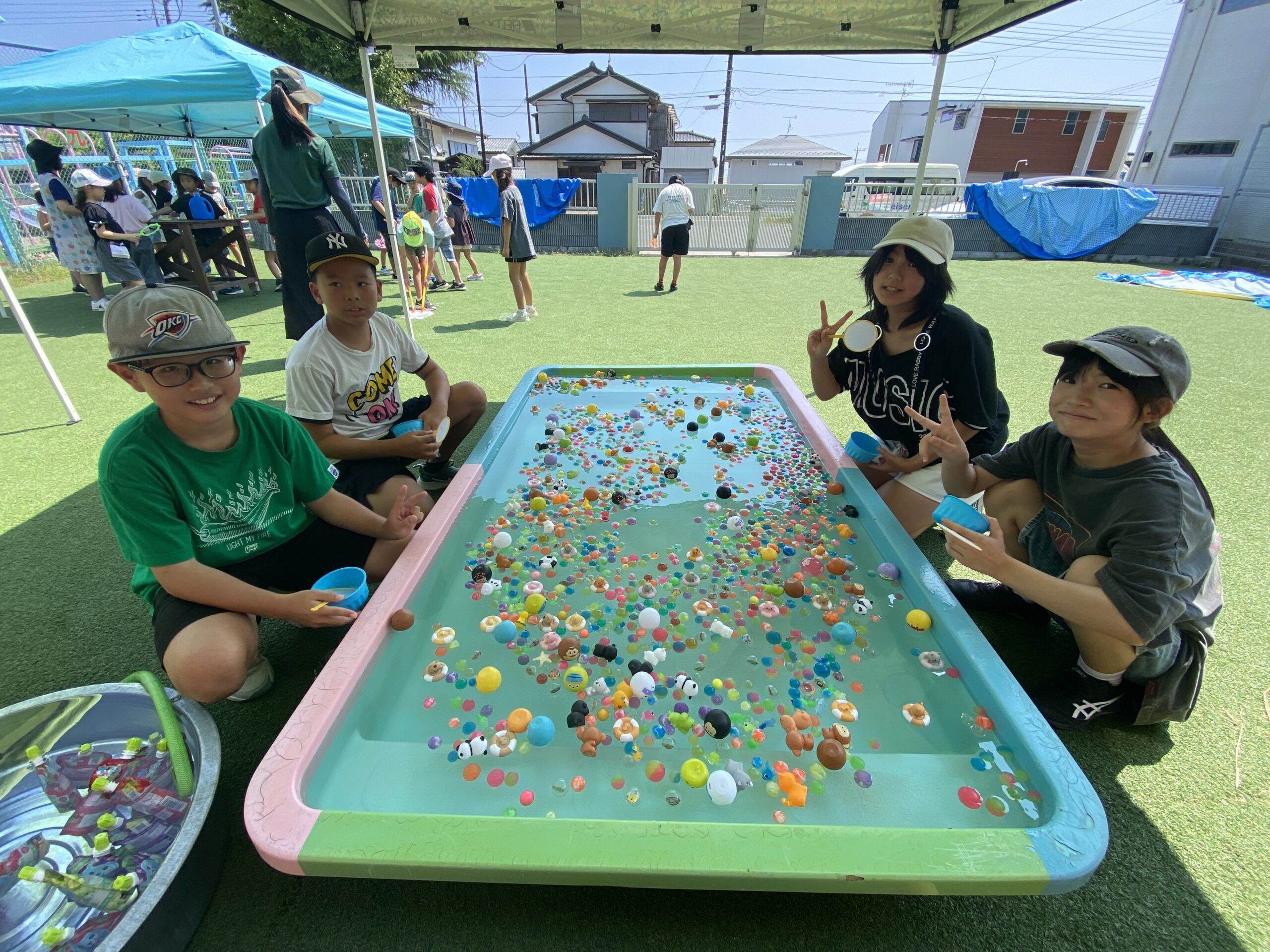 午前中は外で熱中症対策を行いながらスーパーボールすくいやシャボン玉で遊び、