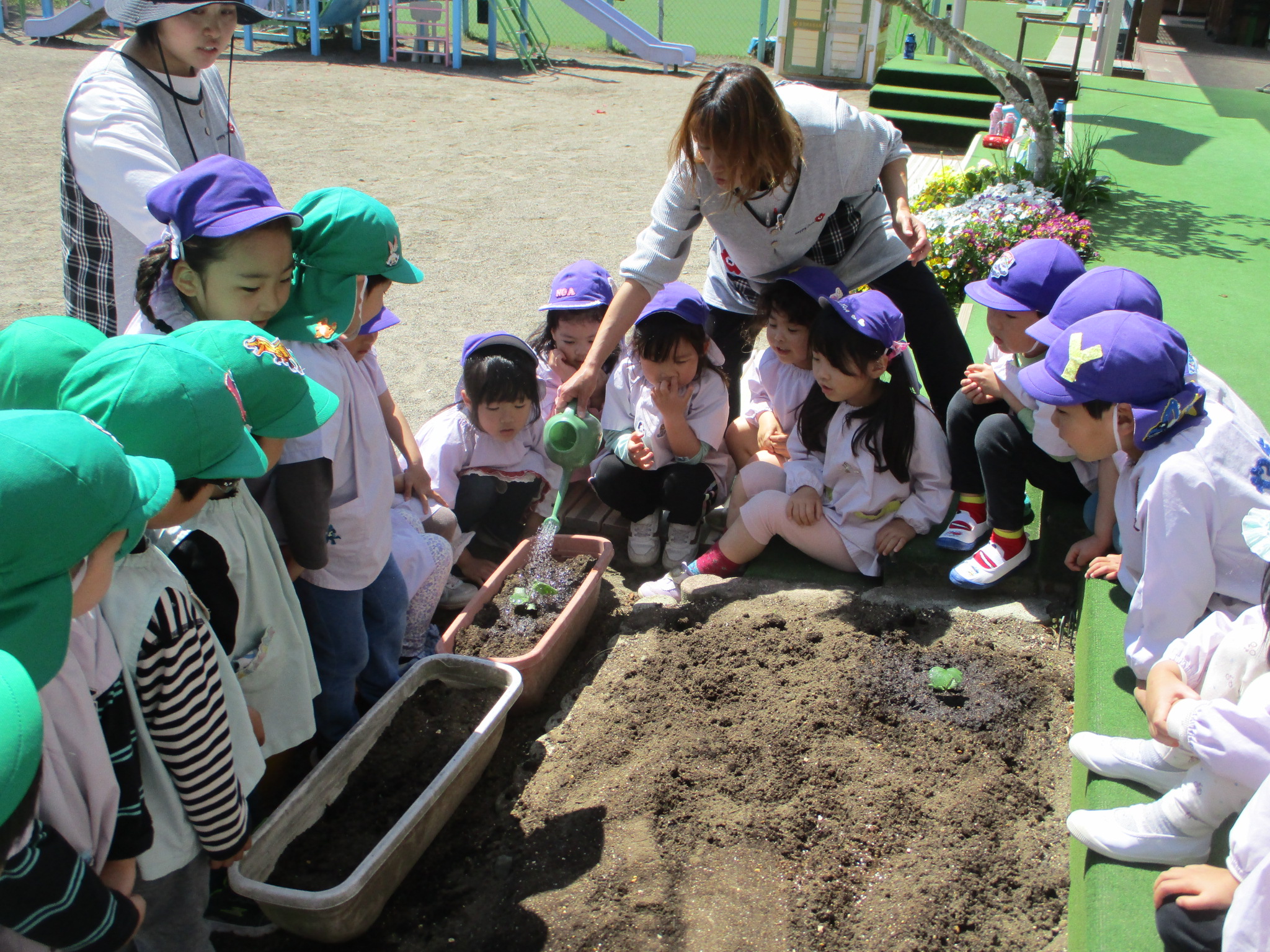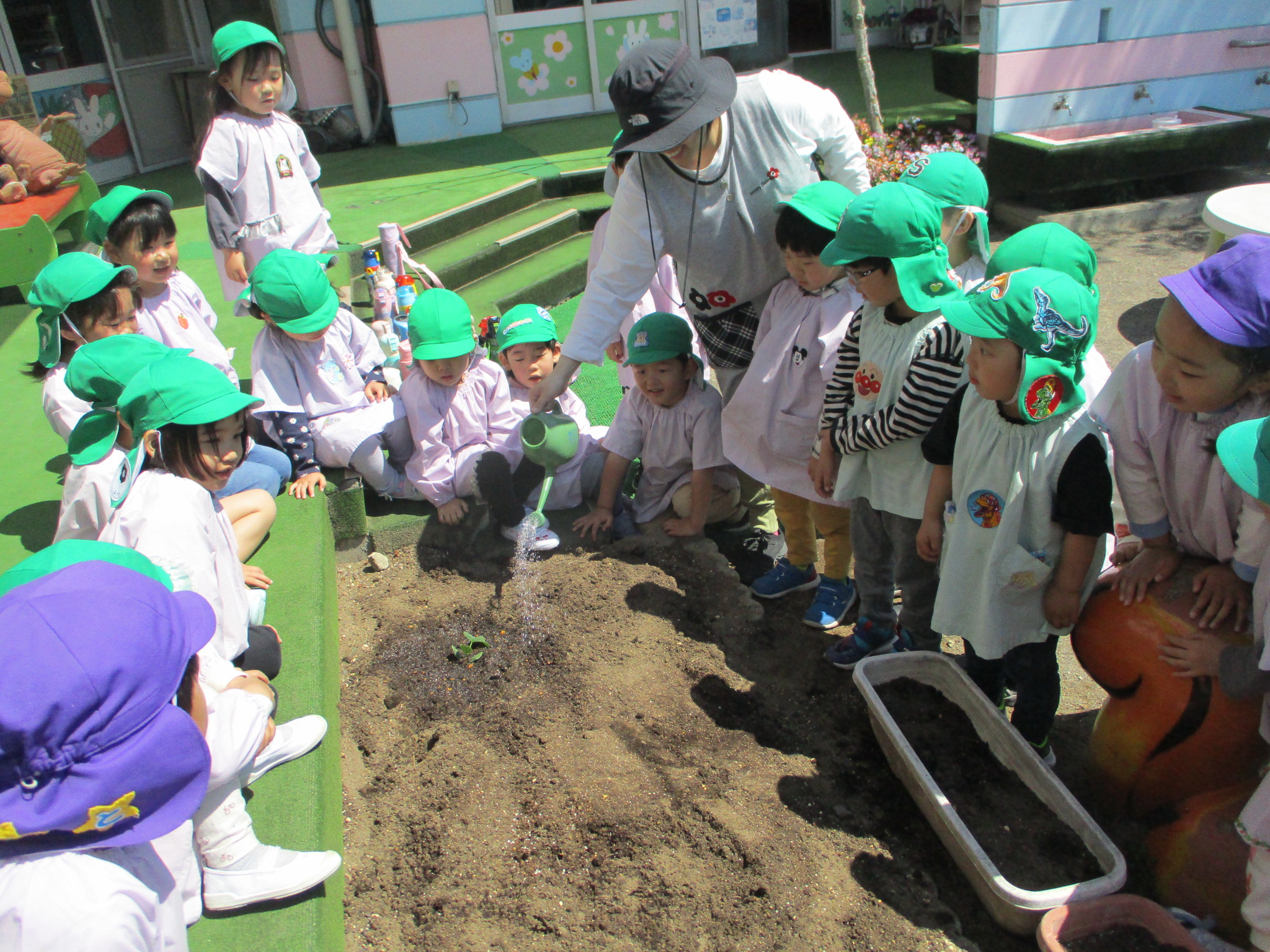 「大きくなーれ」と水を撒いて、今後の成長を願いました。