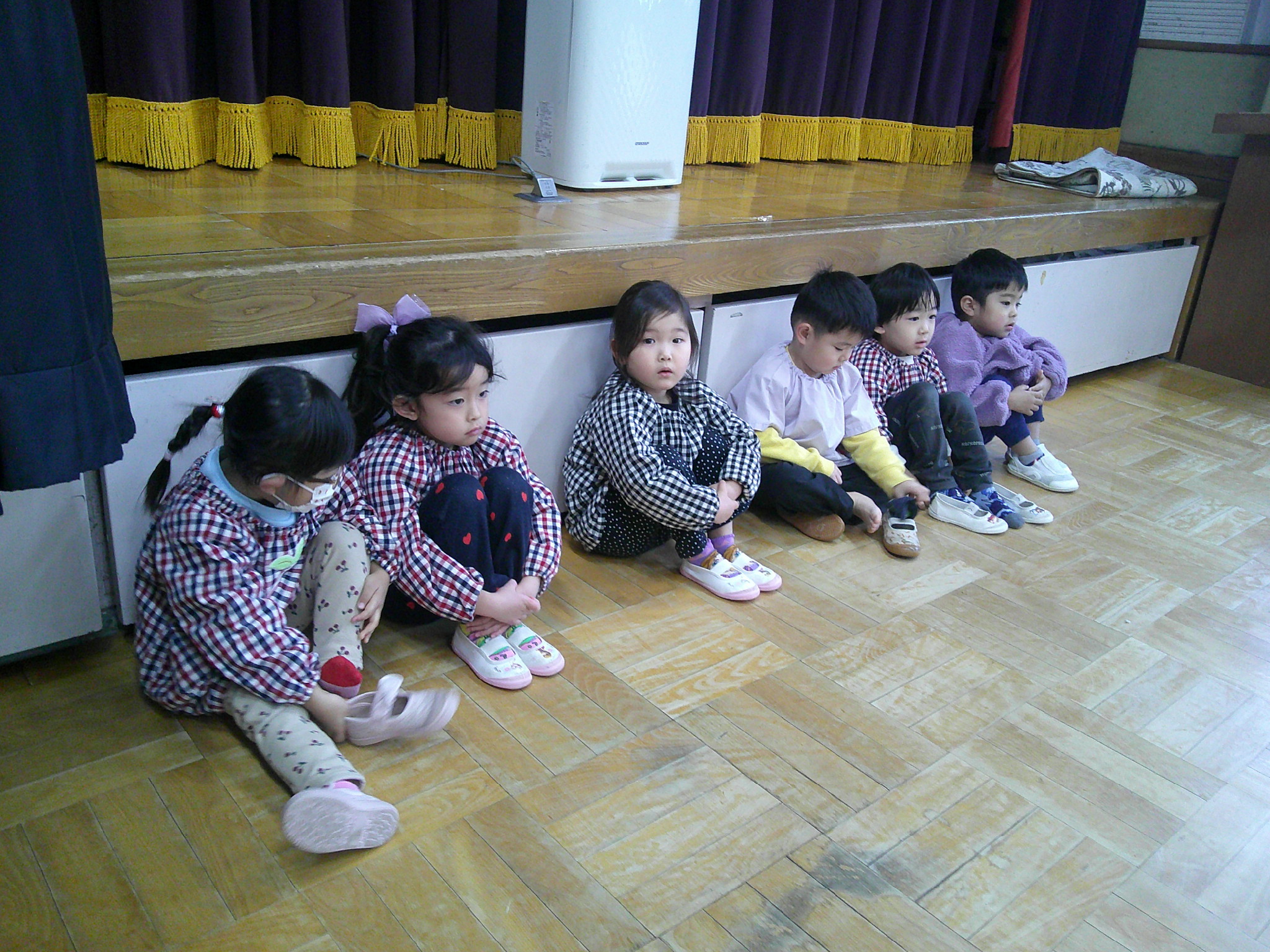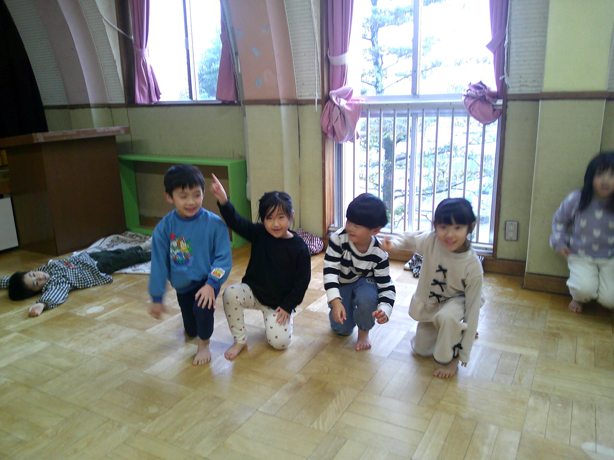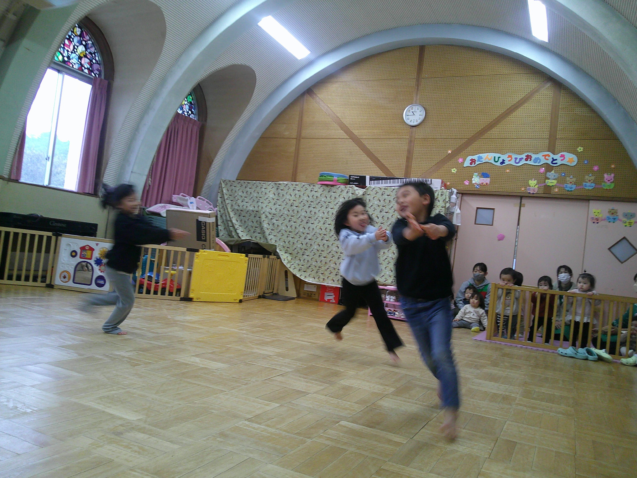 途中で曲が止まるとみんな急いで座ろうとします。人数が減って座れなかったこども達は元気に