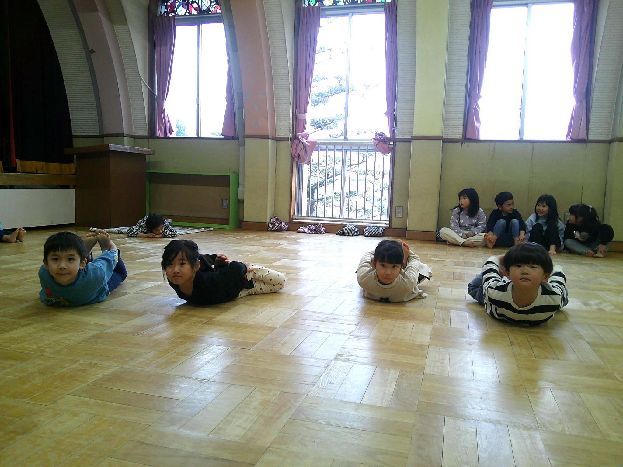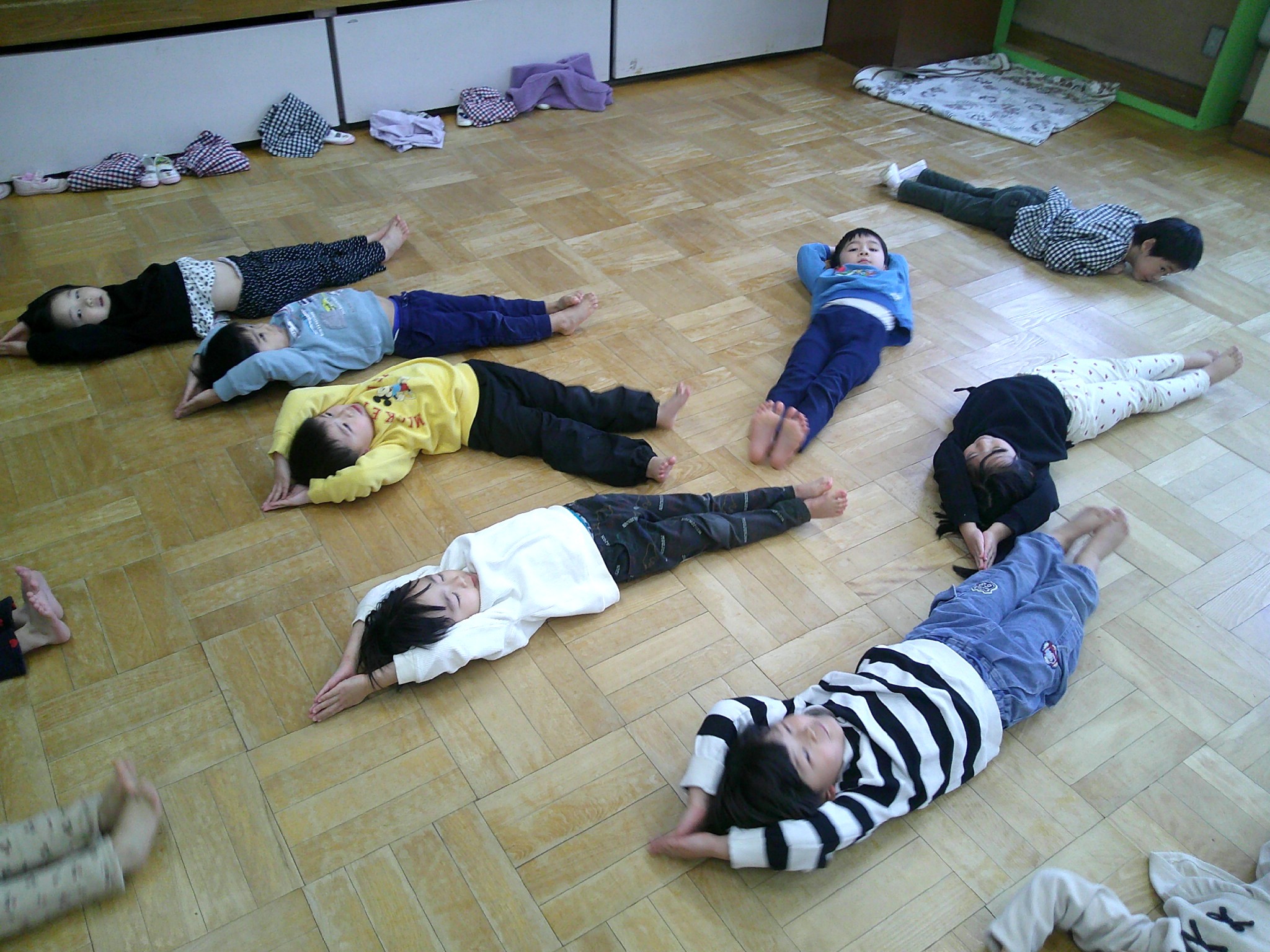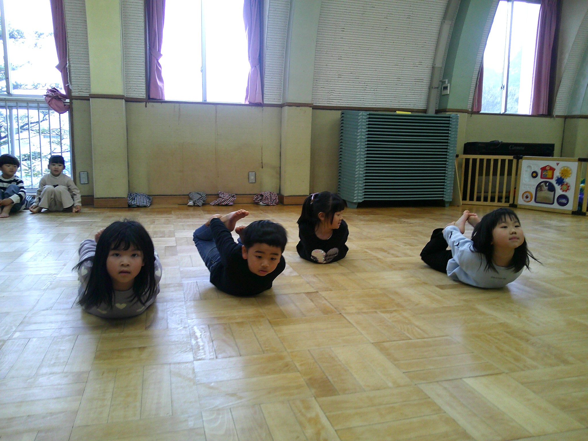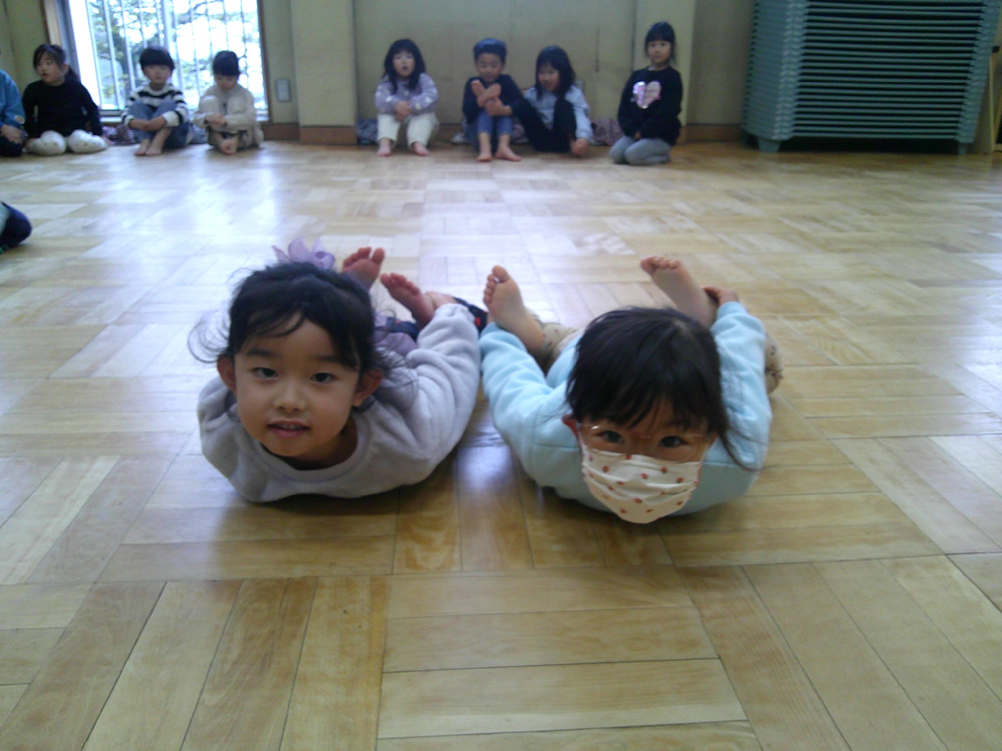 途中で曲が止まるとみんな急いで座ろうとします。人数が減って座れなかったこども達は元気に