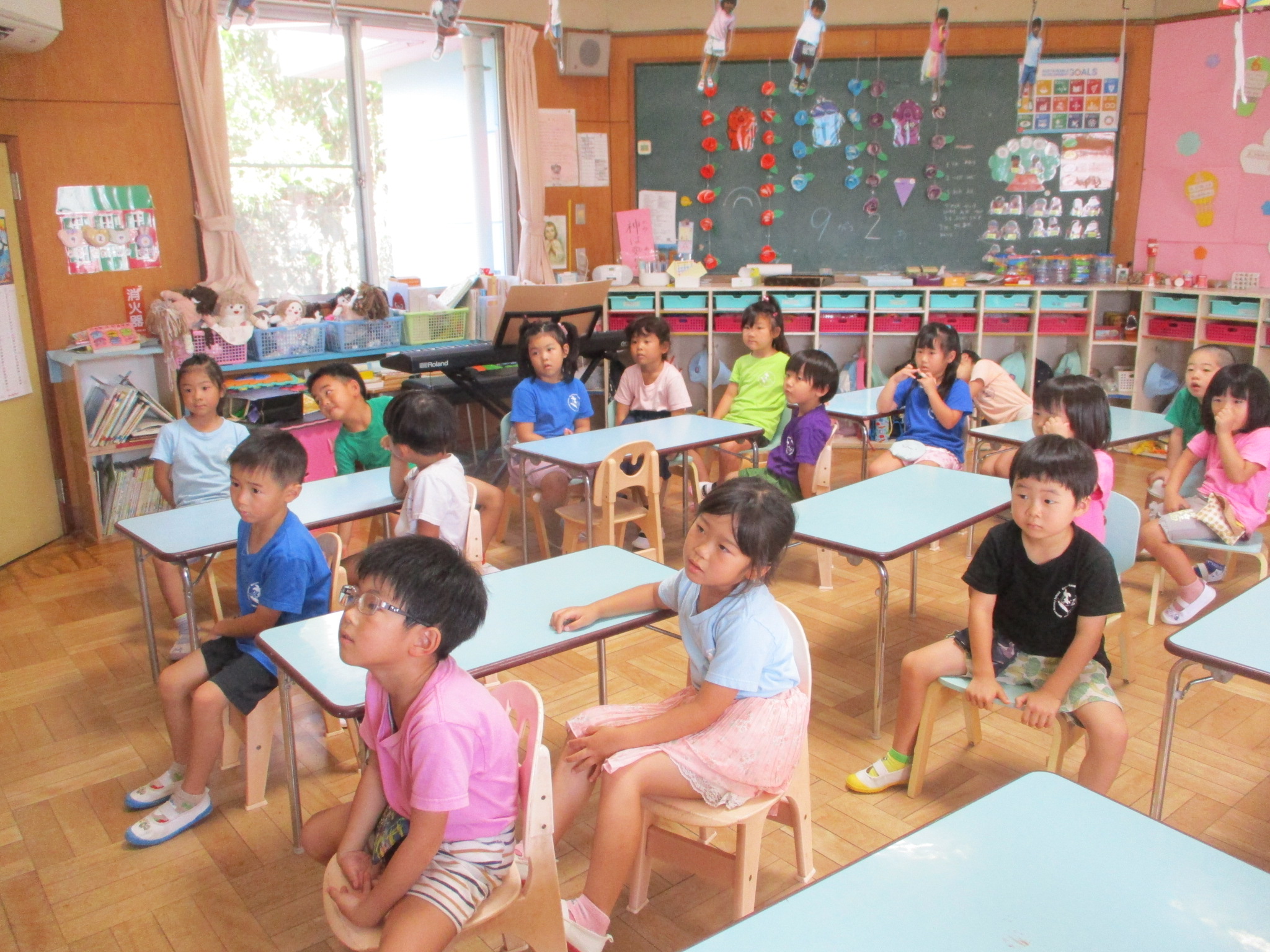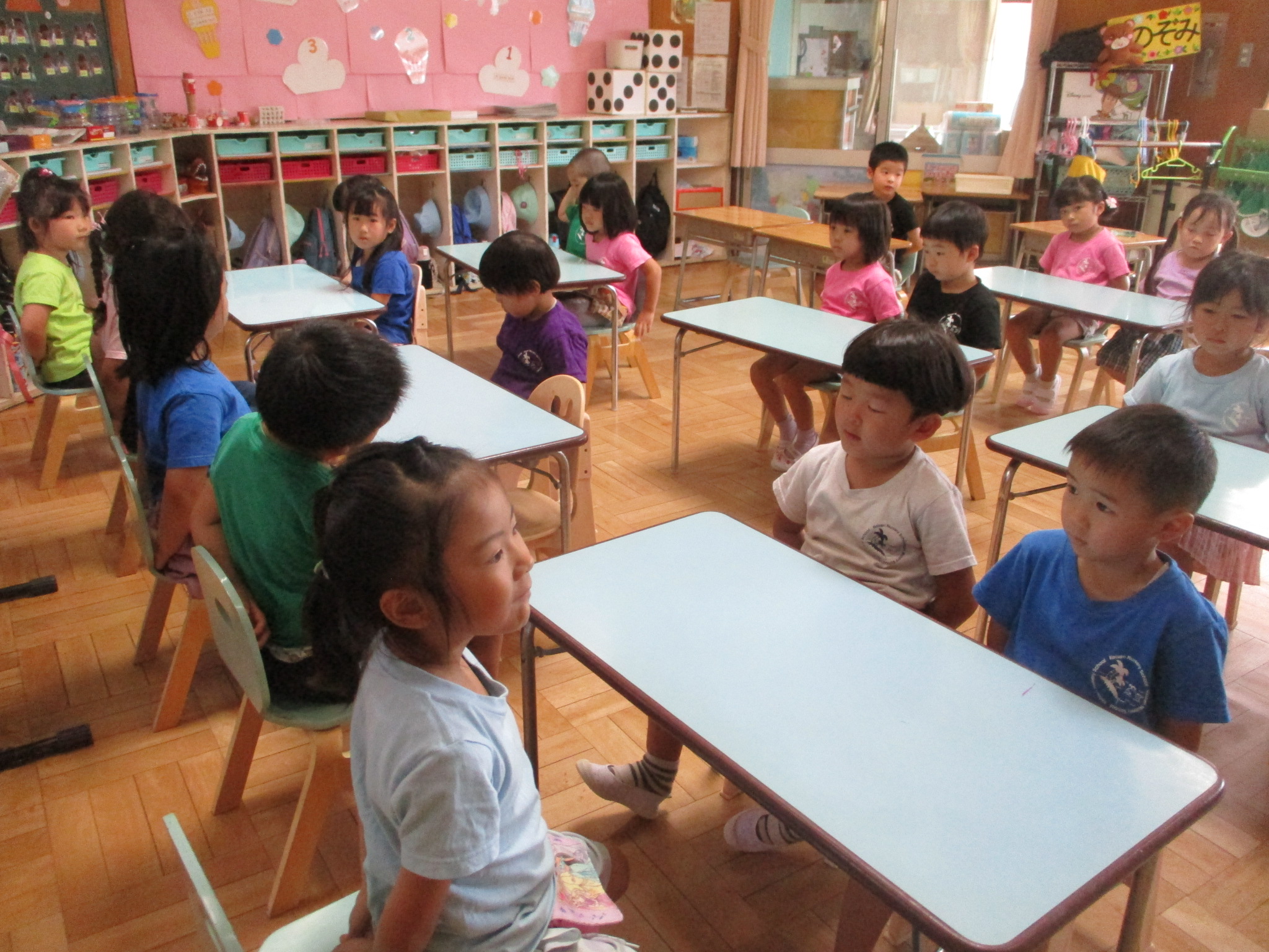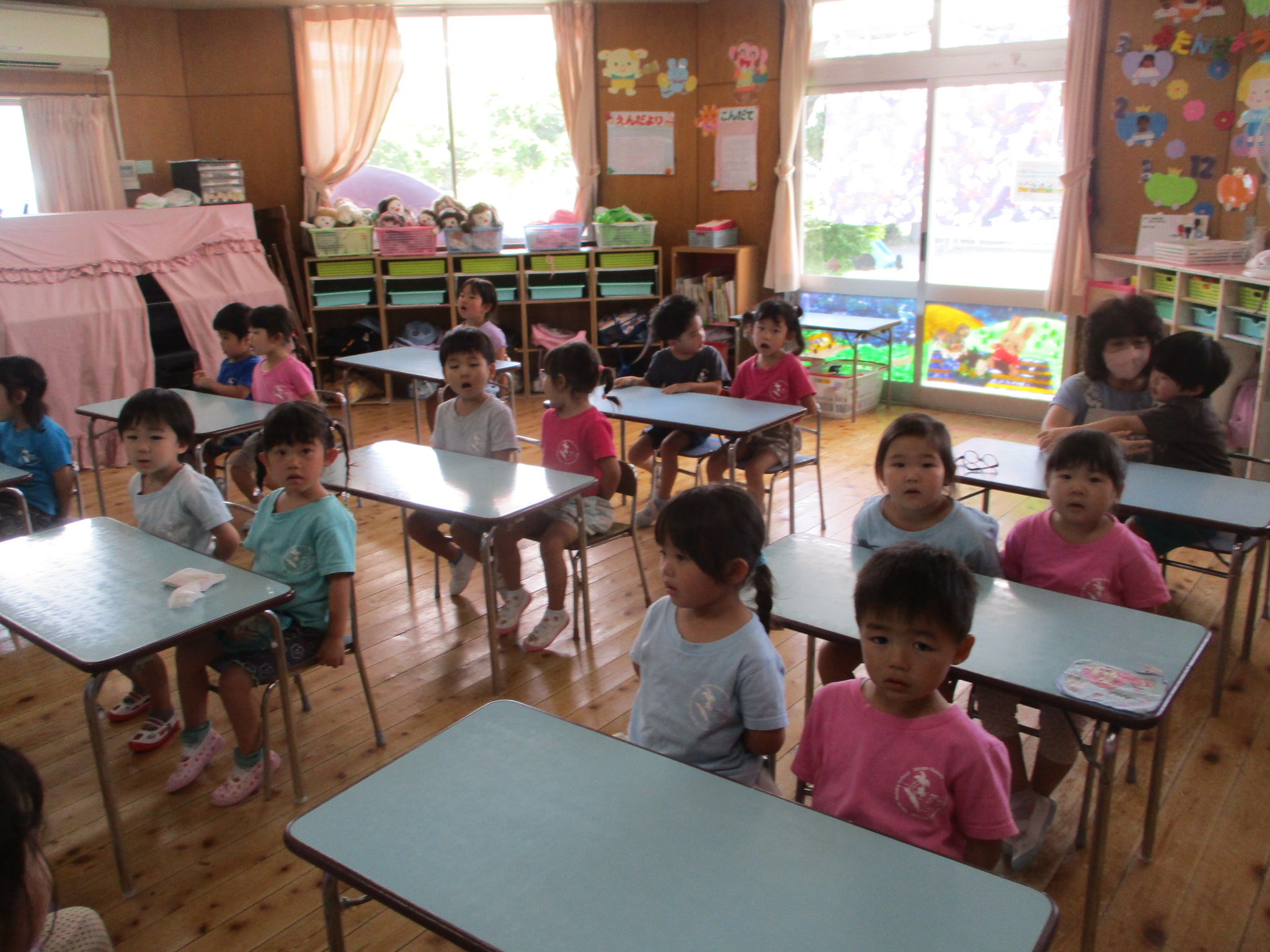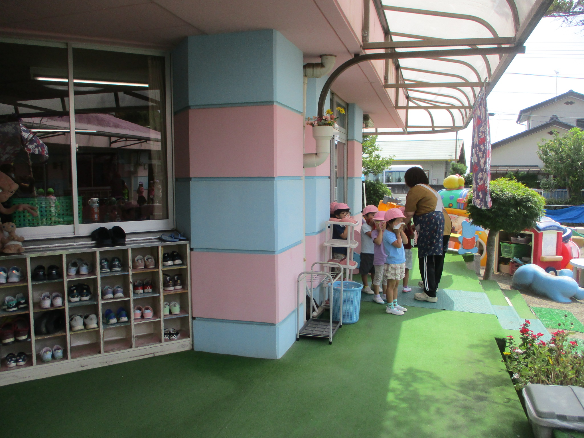 外気温が高いため、避難場所までは行かずに警報~園庭に集合までの流れと注意点を確認しました。