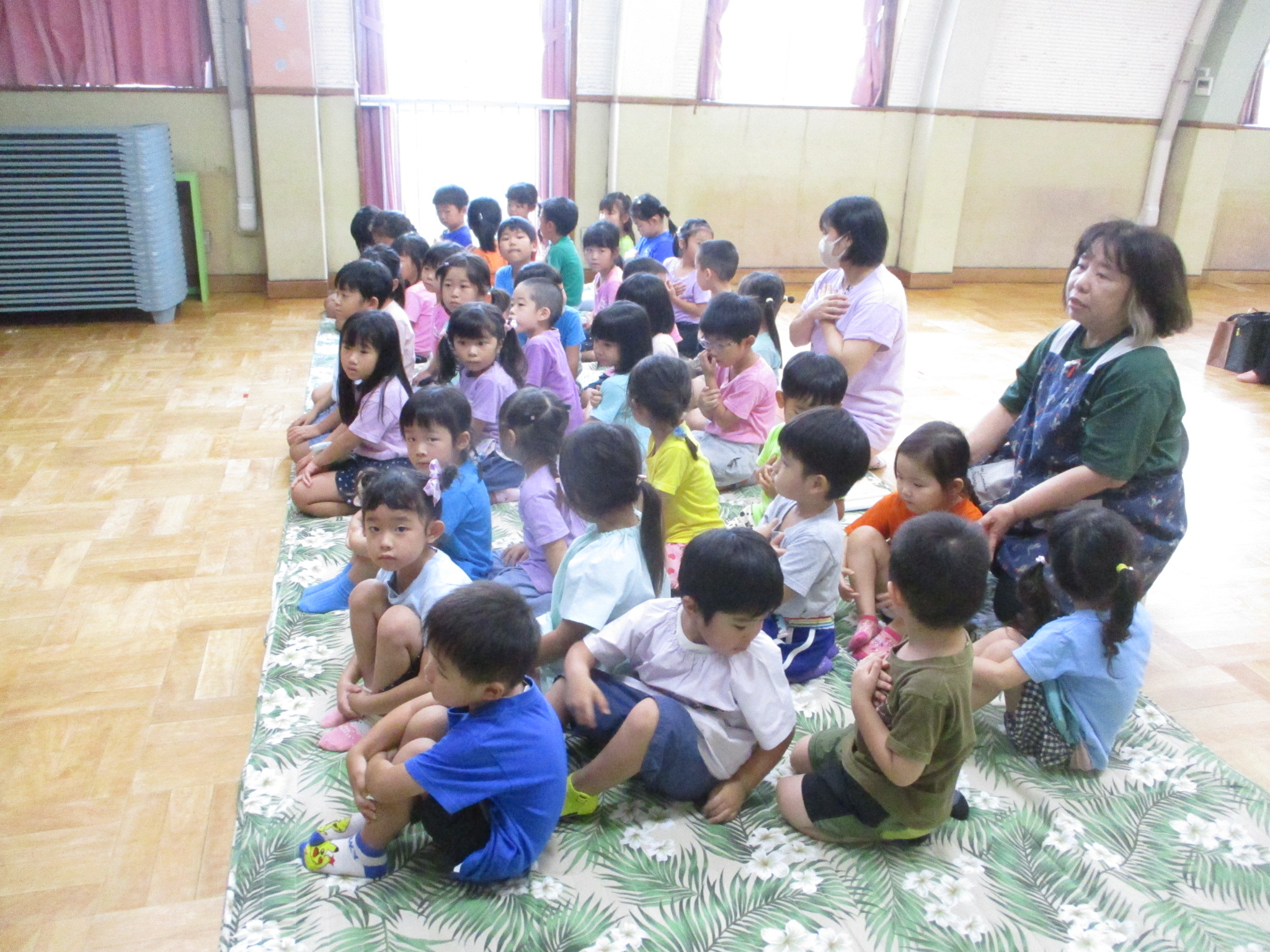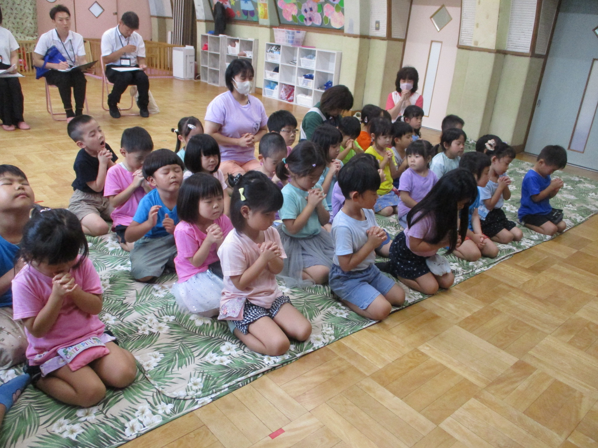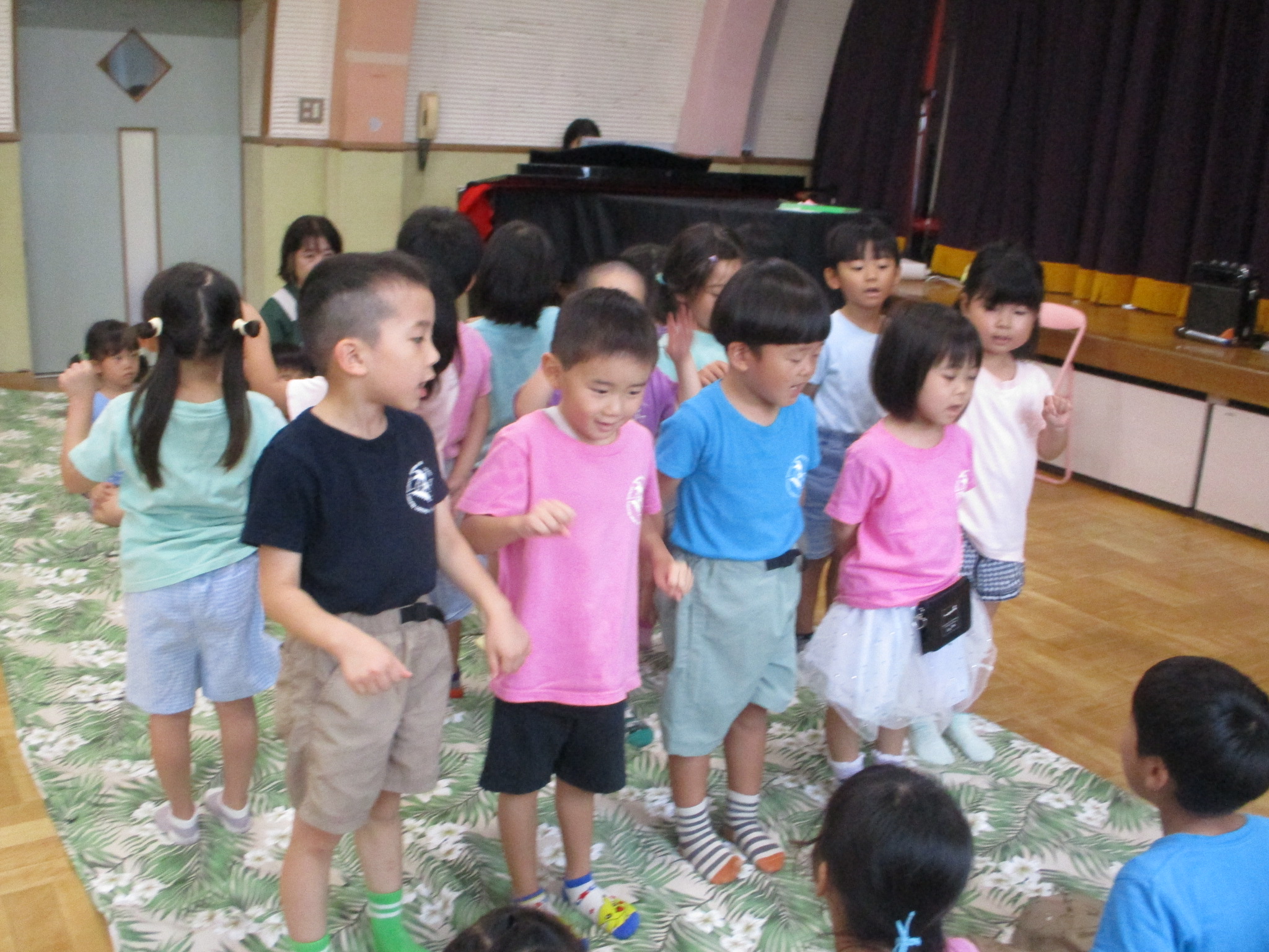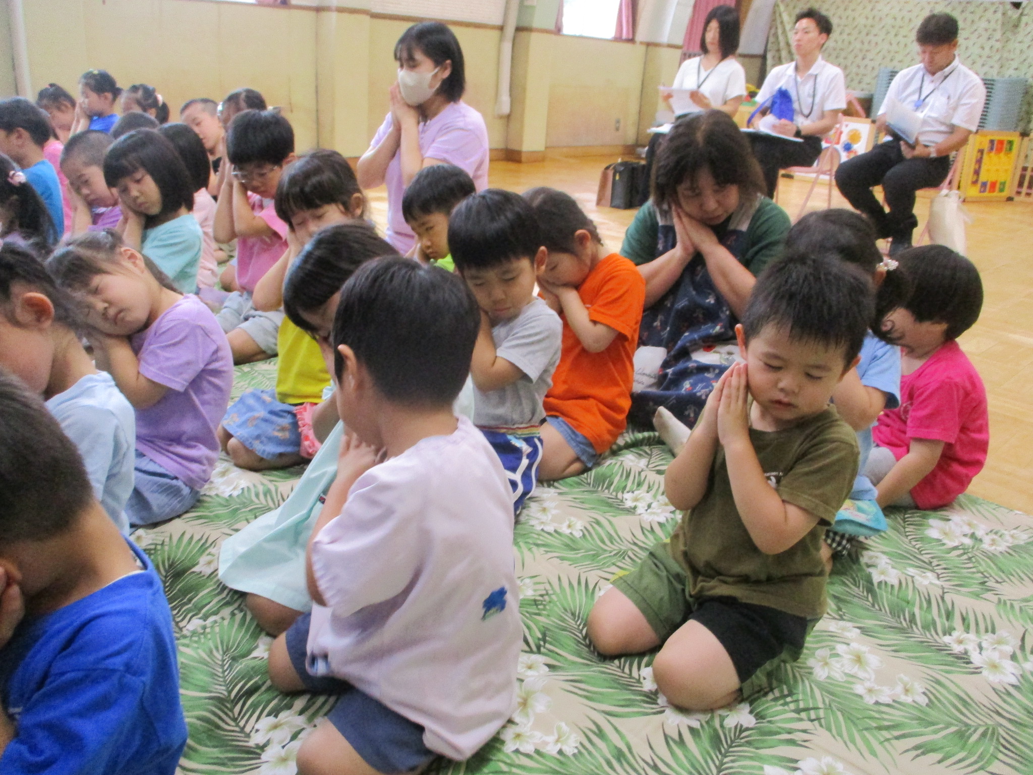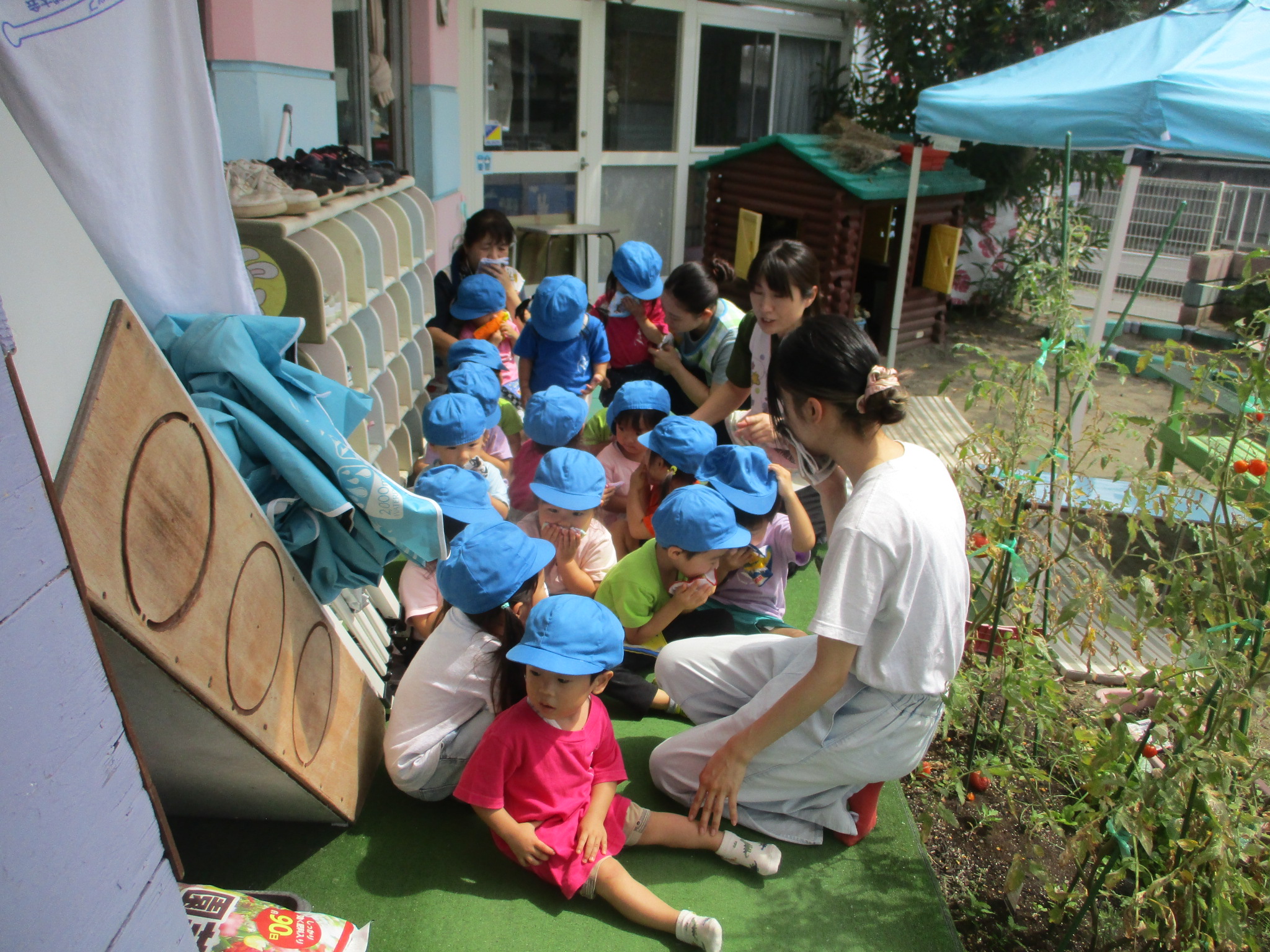 外気温が高いため、避難場所までは行かずに警報~園庭に集合までの流れと注意点を確認しました。